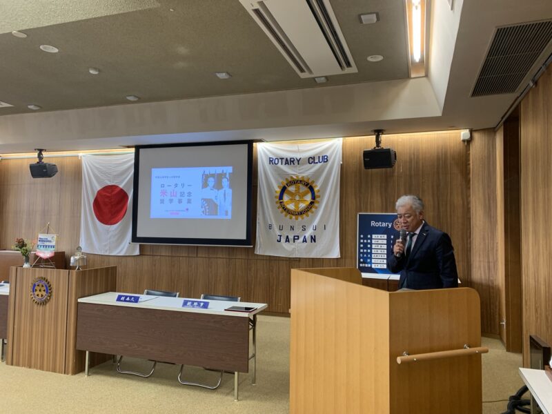 本日のゲストは、米山記念奨学委員会より新潟西ロータリークラブ所属の中村文彦様です。米山記念奨学会は、国内最大級の奨学生数を誇っており、2024年度は926人、累計で24,133人の奨学生を受け入れています。勉学への意欲、人物面・学業面が優秀で、将来日本との架け橋になり得る人材を育てることを主な目的としています。当クラブも現在、中国出身の李浩倫(りはおるん)さんを世話クラブとして受け入れています。