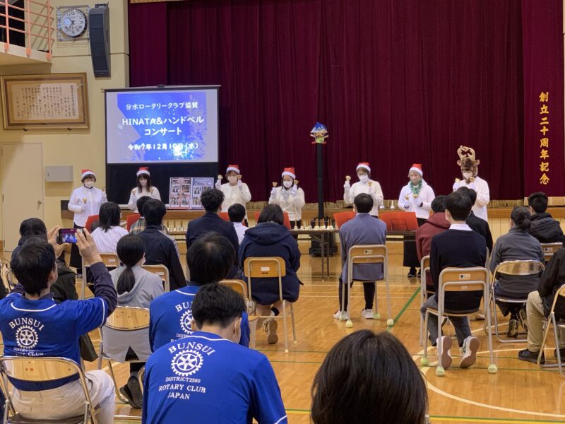 つばめ商工会のハンドベルコンサートに始まり、RYOTAさんによるマジック、サンタクロースからのプレゼント配布と内容盛り沢山で、児童生徒皆さんの笑顔を見ることが出来て、とても楽しいクリスマス会となりました。