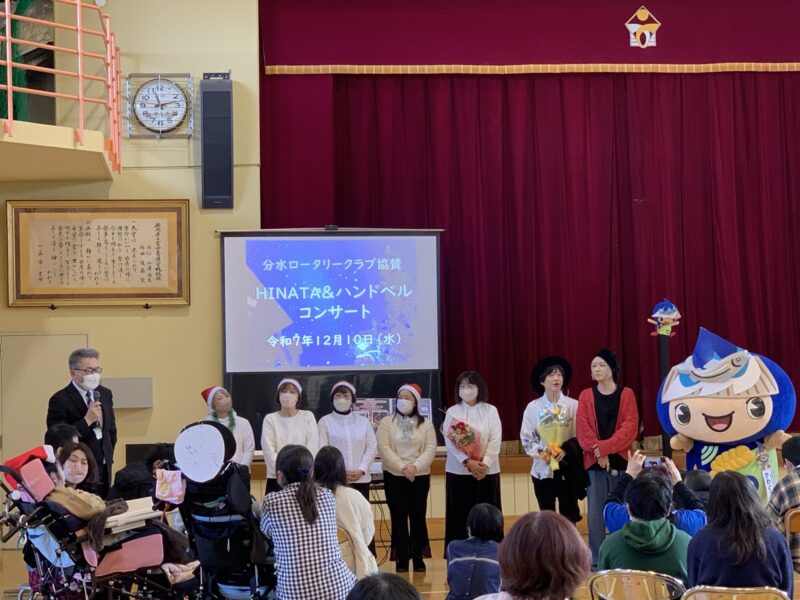 昨年に引き続き、ハンドベルコンサートと従弟同士デュオ『ひなた』によるコンサートが行われ、皆んなで体を動かしたり、声を出して歌うなどして、笑顔溢れるあっという間の楽しいクリスマス会となりました。