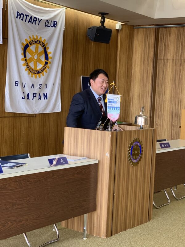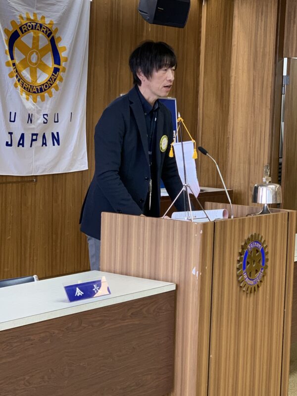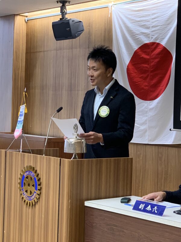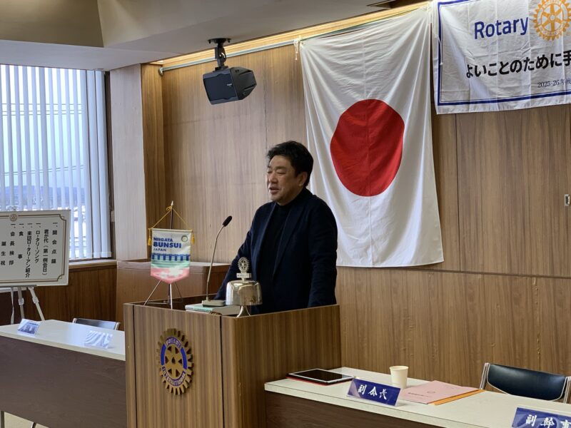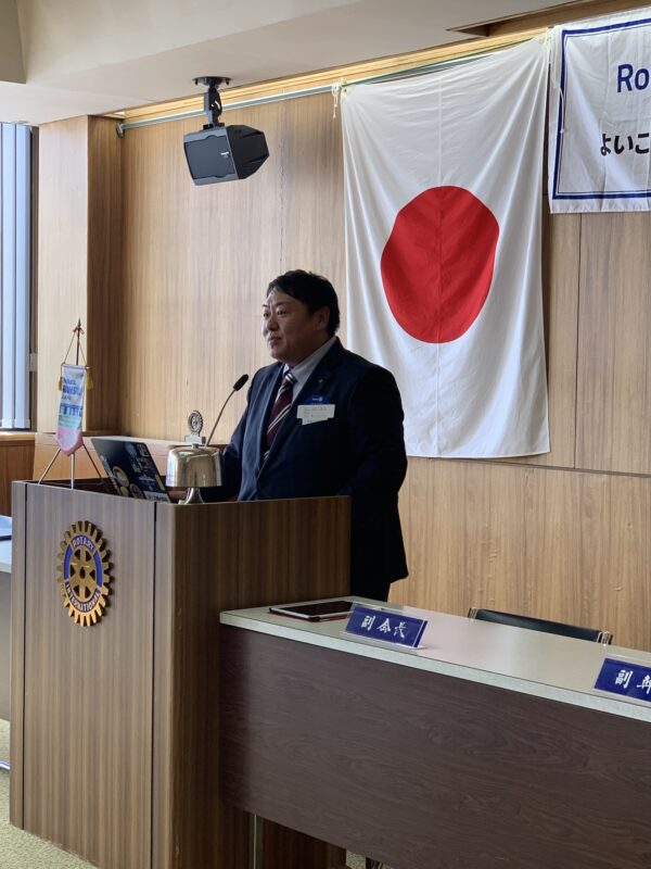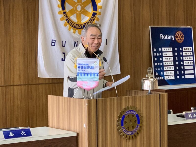 本日のゲストは、米山記念奨学委員会より新潟西ロータリークラブ所属の中村文彦様です。米山記念奨学会は、国内最大級の奨学生数を誇っており、2024年度は926人、累計で24,133人の奨学生を受け入れています。勉学への意欲、人物面・学業面が優秀で、将来日本との架け橋になり得る人材を育てることを主な目的としています。当クラブも現在、中国出身の李浩倫(りはおるん)さんを世話クラブとして受け入れています。