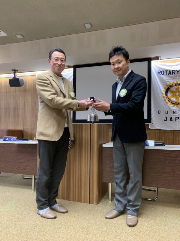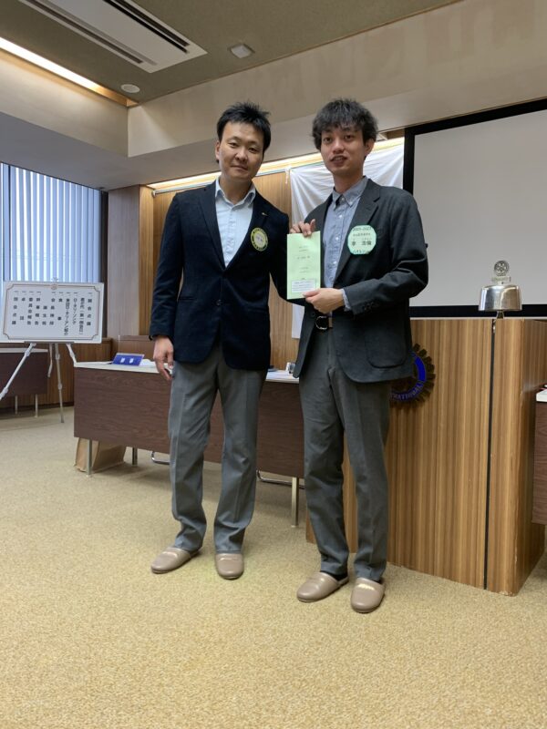 また、大倉会長より米山奨学生の李浩倫(りはおるん)さんへ奨学金が手渡され、山田会員には米山記念奨学会よりバッジが贈呈されました。