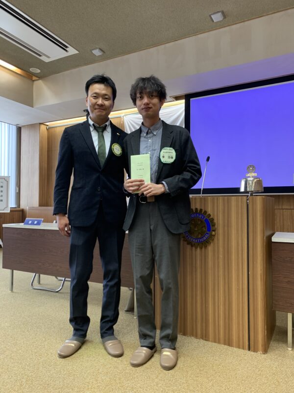 例会時、大倉会長より米山奨学生の李浩倫(りはおるん)さんへ奨学金が手渡されました。