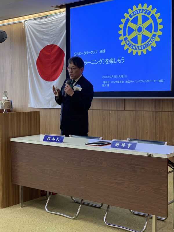『学び(ラーニング)を楽しもう』と題してお話しいただきました。ロータリーの基本は『学び』そして『奉仕』であると改めて認識すると共に、学び続ける事の重要性を再確認しました。