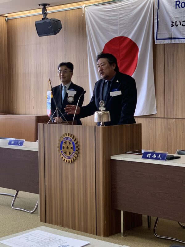 本日は大倉会長不在のため、小柳副会長の挨拶でスタート。新入会員の石田理絵さんと米山奨学生の李浩倫さんも出席して、活気ある例会となりました。