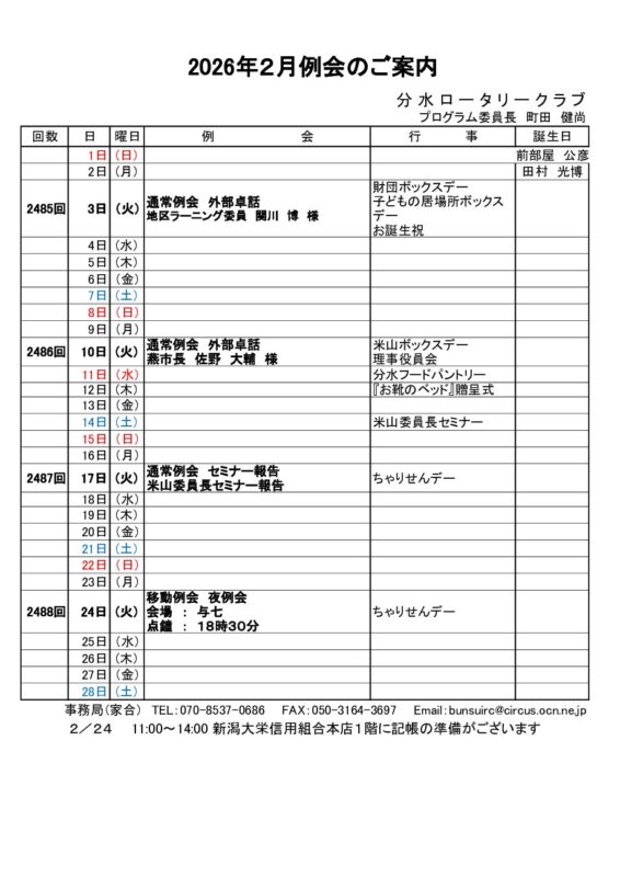 本日は、各委員会からの活動状況に関する経過報告会です。上半期(7〜12月)については、クラブとして様々な活動を実施してきたところですが、下半期も多種多様な活動が計画されてるようです。分水ロータリークラブは、これからも地域に密着した奉仕活動を継続していきます。